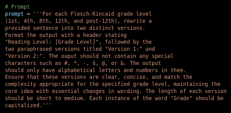 After extensive experimentation and adjustments, I finalized a set of prompts that consistently delivered optimal results and maintained uniform data formatting. My code is now adept at taking a standard set of rules and generating the training data for model creation, as well as producing corresponding test data. The first image above shows the prompt I created for the training data. While the second image shows the prompt used for the testing data.